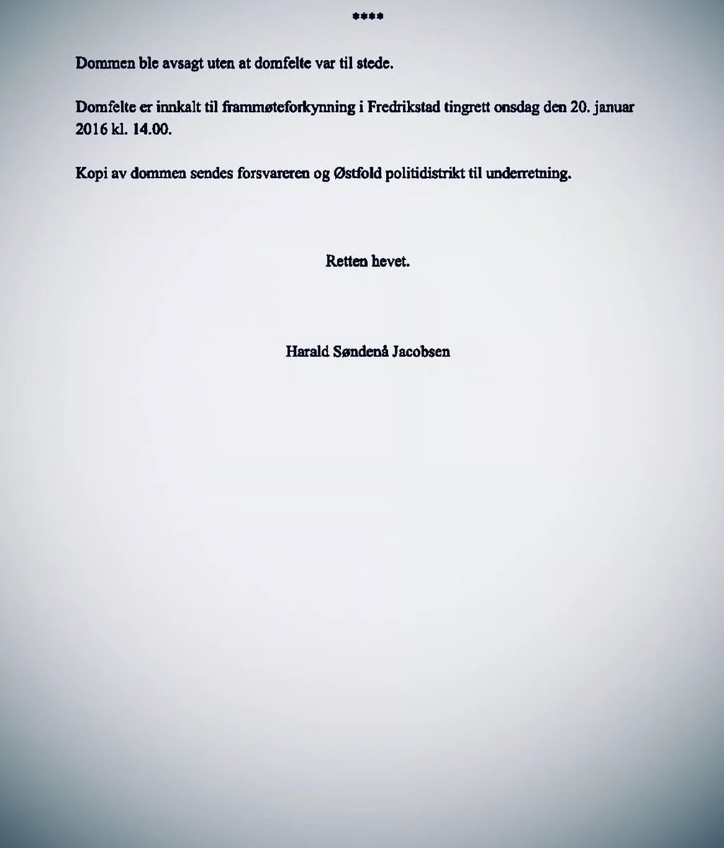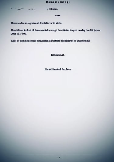 The Fredrikstad District Court issued a verdict of acquittal on January 20, 2016, and a copy of the judgment was sent to the defense attorney and the Østfold Police District for information.