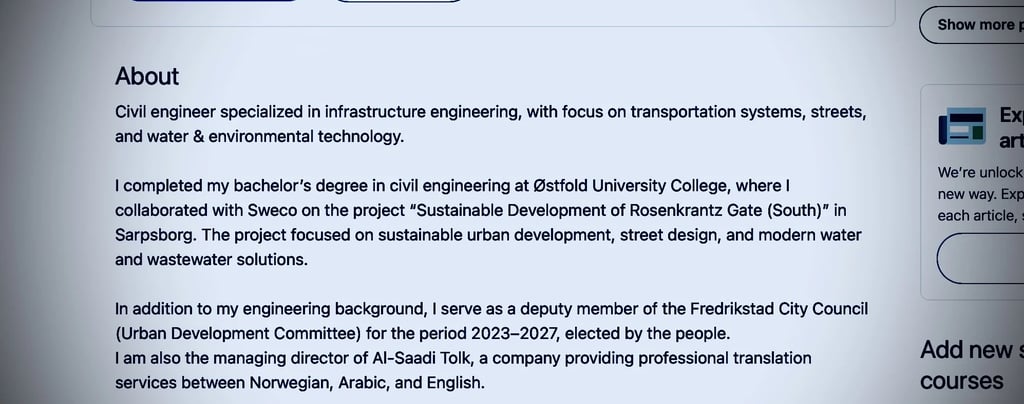 He also lists himself as a deputy member of the Fredrikstad City Council and the Urban Development Committee for the 2023_2027 term, and as managing director of Al Saadi Tolk, a company offering translation services.