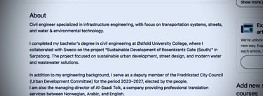 Based on publicly available profiles, including LinkedIn, this individual presents himself as a civil engineer specializing in infrastructure, transportation, and water and environmental technology, holding a bachelor’s degree from Østfold University College and reporting collaboration with Sweco on a sustainability project in Sarpsborg.