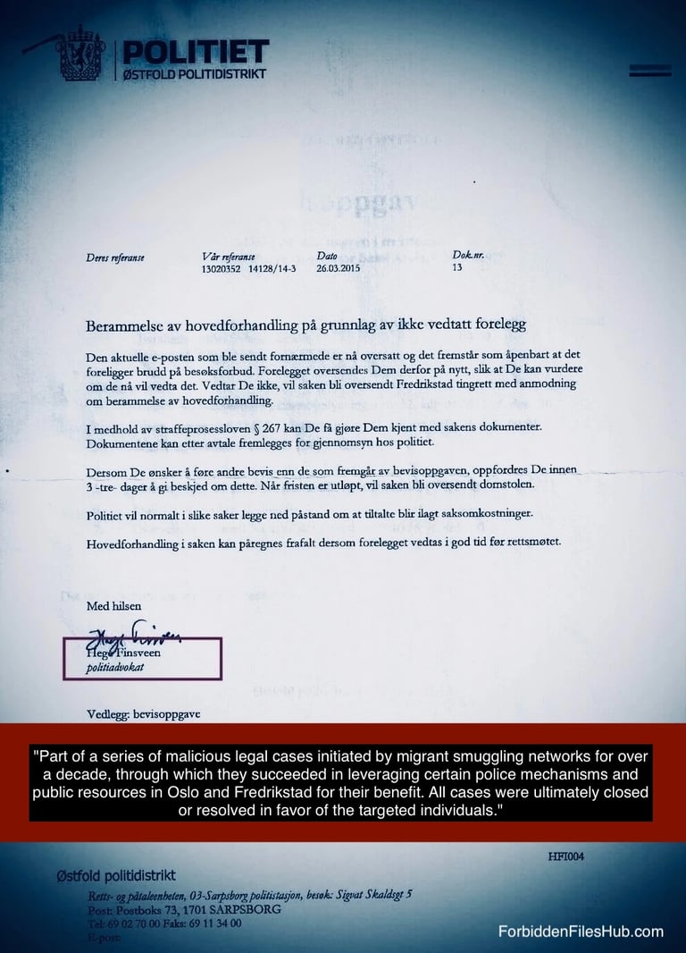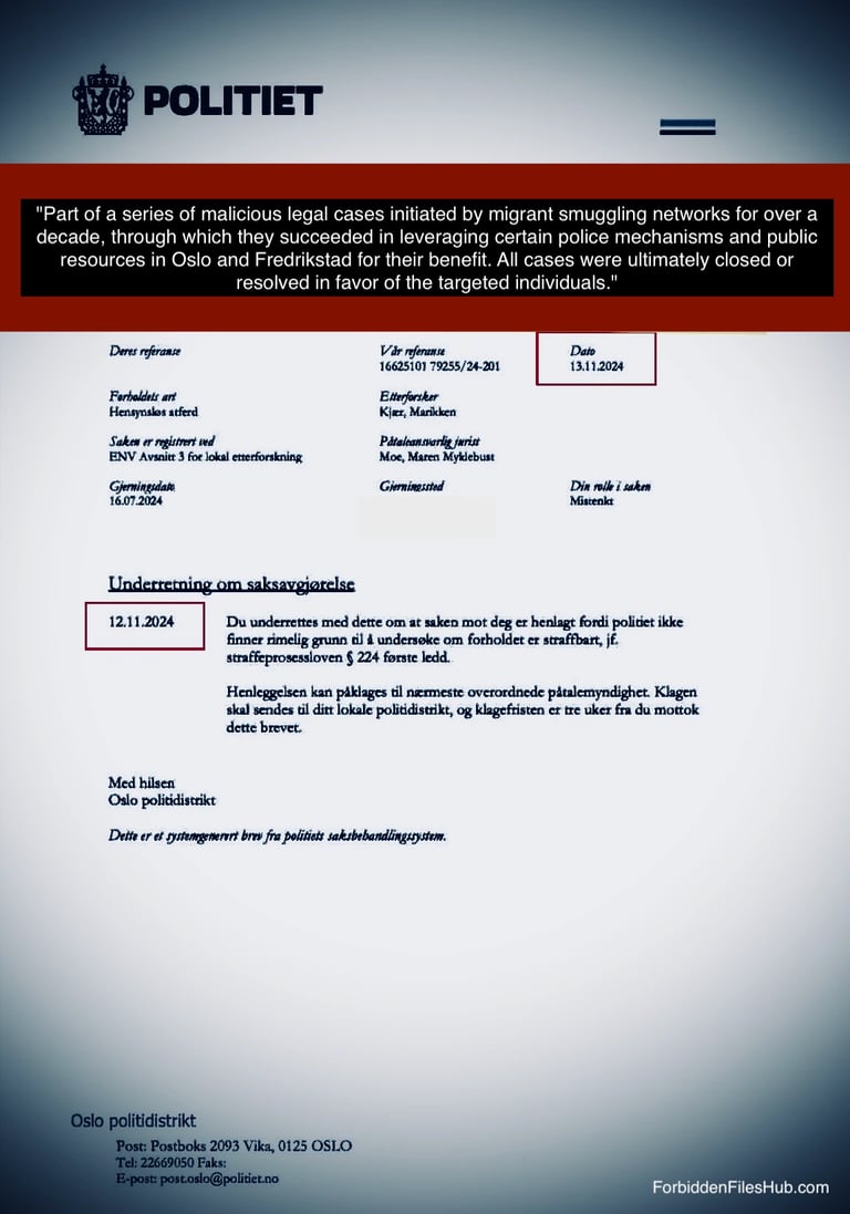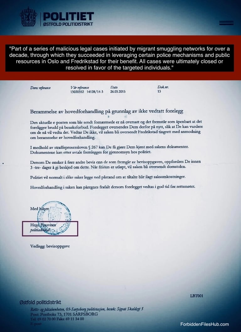 Filene representerer en del av det tilgjengelige materialet og viser mer enn 27 saker konstruert for å utnytte rettssystemet, med involvering av enkelte elementer i politiet i Oslo og Fredrikstad for å oppnå beskyttelse eller ulovlige fordeler.